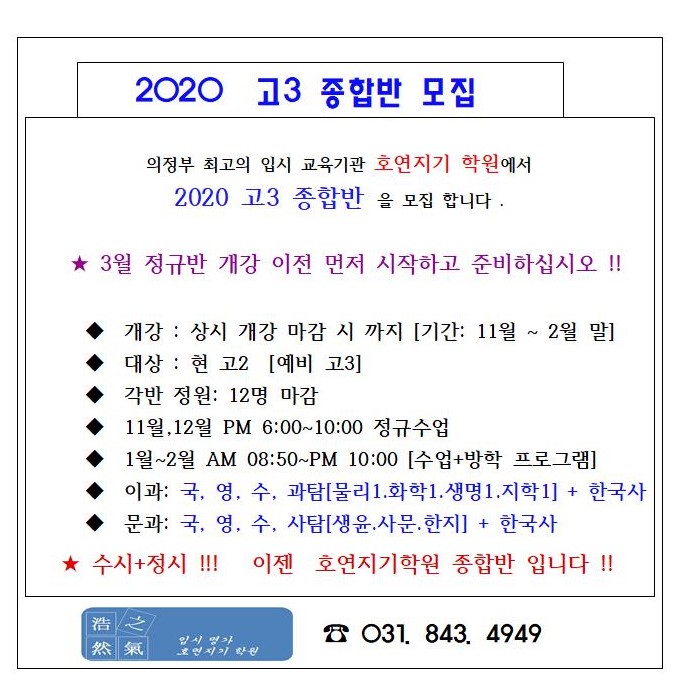 ¾È³çÇϽʴϱî.ÀÇÁ¤ºÎ À¯ÀÏÀÇ °íµîºÎ, Àç¼ö Á¾ÇÕ¹Ý Àü¹® ÇпøÈ£¿¬Áö±â ÇпøÀÔ´Ï´Ù. º»¿ø¿¡¼ 2020Çг⵵ °í3¹ÝÀ» °³¼³ÇϰíÀÚ ÇÕ´Ï´Ù.Çö °í2¿¡ ÇØ´çÇÏ´Â ÇлýµéÀ» ´ë»óÀ¸·Î Çϸç Áö±Ý±îÁö °æÇèÇß´ø Çпøµé°ú Â÷º°ÈµÈ ÇнÀ ½Ã½ºÅÛÀ» Á¦°øÇÒ °ÍÀ» ¾à¼Óµå¸³´Ï´Ù. ÀÚ¼¼ÇÑ »çÇ×Àº ÀüÈ ¹× ³»¿ø »ó´ã ¹Þ¾Æº¸½Ã±æ ±ÇÇÕ´Ï´Ù.